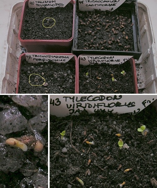 Namočená semínka mají za sebou více než 70 hodin. Jak jste sami mohli vidět, bezkonkurenčeně nejrychlejší klíčení předvedla avonie (č.7), podobně rychlé klíčení jsem za svou výsevní praxi viděla jen u příbuzných anakampserosů a pak u astrofyt (čeleď Cactaceae). Semenáčkům stačilo pár hodin namočení a už se začaly klubat. Je to dané asi podobnou strategií, o které psal Jirka v článku o strumárii - semena avonií se rychle sypají ze suchých plodů a snaží se stejnou sezónu vyklíčit a do další vlhké sezóny přežít už jako slušně sukulentní semenáčky s minimálně prvním párem děložních listů (proto možná u avonií a anakamsperosů po vývoji prvních sukulentních listů trvá dlouho, než naroste další pár listů). Č.6 – Anacampseros má skutečně už také první naklíčené semeno, ostatní si však dávají na čas a moc ochotně neklíčí. Č.29 – Oxalis už ukazuje tenké ohnuté stonečky s dvěma děložními lístky. Semenáčky moc sukulence nepředvádějí, což se napraví až v pozdějším věku. Rhyticoaulon (č.35) přidal další klíček, vidíte ho na makrofotografii. Nejúspěšnější v klíčení je asi desátá miska, kde se tylekodon (č.43) má čile k světu a ve vedlejších květináčcích se objevuje první naklíčené talinum (č.40) a trichodiadema (č.42) . U velkých semen cyfostemy (č.12) se začíná objevovat plíseň, což je možná způsobeno nedokonalým očištěním semen od zaschlých měkkých částí. Zítra nezbyde, než namíchat Previcur a výsev ošetřit. S klíčením cyfostem je obecně problém, nevěřím příliš v úspěch, ale naděje umírá poslední. Výsevní deníčku, končím, uvidíme se zítra. R.