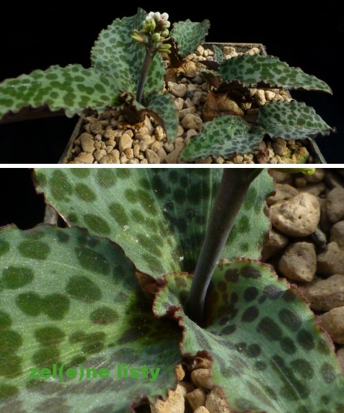 Největší ozdobou Drimiopsis atropururea jsou samotné listy – jednak základní barvou nádherné svěží zelené ze svrchní strany (doplněné výraznými skvrnami) a červenavé barvy na spodní straně listů. Třešínkou je pak krepování okrajů listů, dodávající této cibulce (skromně řečeno) vzhled krásného drobného šperku. Konečně posuďte z našich fotek sami….Květy jsou takové filigránské, zelenkavé a pro tento rod vlastně typické.
