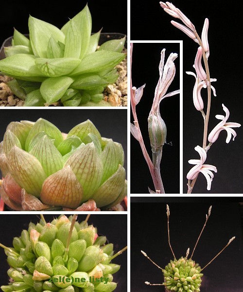 Druhové jméno cymbiformis znamená ve tvaru člunu, což se týká vzhledu listů rostliny. H.cymbiformis vytváří nevelké růžice sytězelených listů a jak už jsem naznačovala, hlavní růžice nikdy nezůstane osamělá, ale přidá si kolem sebe spoustu dalších. Listy jsou tvarem oválné až kopinaté, bez zoubků na okraji, na přímém slunci se téměř až žlutozelená svěží barva mění na narůžovělou. Květenství dorůstá délky až čtvrt metru a pokud máte celou skupinku rostlinek, čekejte, že vykvetou i vedlejší růžice listů. Bílých květů bývá 10 – 15, nakvétají odspodu směrem nahoru.