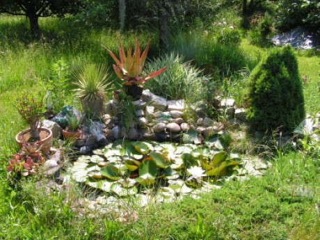 Rybníček s rybou, leknínem a rostlinami rodů Agave a Aloe.jpg